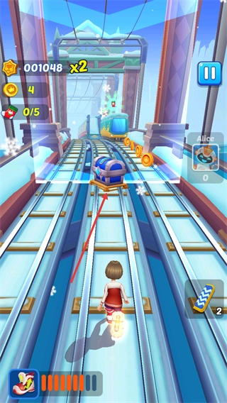 在跑酷的过程里,你需要操控角色顺着轨道前行,避开途中的各种障碍,同时收集轨道上的道具,以此来推动任务的进度。