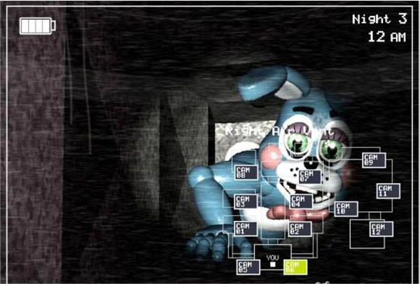 需要注意两个要点:一是玩家若长时间没有任何操作,会有玩具熊出现并直接将其吞噬;二是如果一直只关闭房门而不打开灯光照射外面的走廊,同样会有熊出现把玩家吃掉。(这一关卡里,除了能听到熊的喘息声,还新增了脚步声,玩家得及时判断声音是从哪里传来的,接着去关闭对应的房门,防止熊进入屋内。)