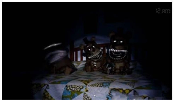2大概在2点左右,你会听到熊的笑声,此时要立刻检查前方和身后的情况。如果熊在柜子那里,就把柜子门关上;要是在身后,就打开灯把它驱散。之后就重复这样的流程:通过脚步声判断熊的方位,听到笑声就检查前后。(这一关和之前不一样的地方是,玩家就算长时间不开灯照射走廊,也不会有其他熊来攻击,所以听到声音时直接关门就行,不用开灯,这样能节省一些时间。)