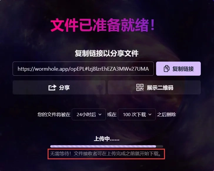 2. 边传边下:该软件的核心优势是能够支持传输与下载同步开展。用户只需把链接复制后发送给接收方,就算文件还没有上传完成,对方也能够同步下载资源!