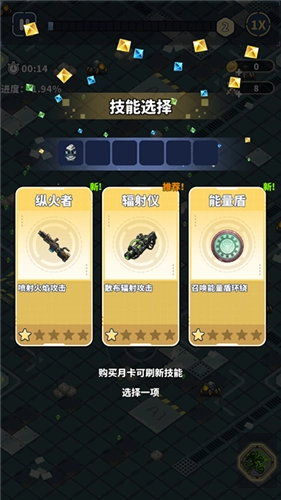 3、成功消灭敌人后,会掉落绿色能量,拾取绿色能量能够增加经验值。当经验值累积满时,即可进行技能选择。