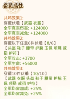 4. 接下来我们说说神装的套装属性。神装都具备相应的套装属性,要留意的是,神装分为6件套与10件套。6件套的关键部位包括头盔、鞋子、护腕、玉佩、项链、戒指、护符,从这八个部位中任选六件即可。10件套则是在6件套的基础上,再加上武器和衣服。6件套主要作用为增加全军的攻击与生命,10件套能够提升全军的伤害加成与减免。因而6件套属于过渡阶段,10件套才是我们最终的目标!当主公们完成较低等级的10件套合成后,还能逐步合成更高级的套装呢~