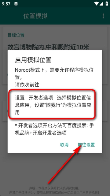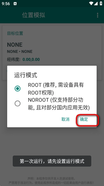 4、在启动位置模拟功能后,需选择运行模式,推荐使用下方的noroot模式。