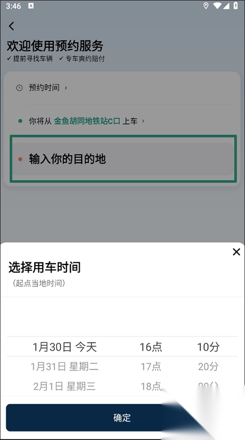 4、接着在预约界面选择好用车时间,点击确定后,找到并点击“输入你的目的地”选项;