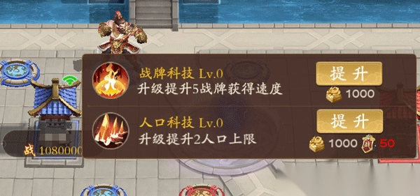 5、点击带有自身名称的科技建筑可以升级塔防科技,人口科技可提升上阵人口上限,武魂科技可提升战牌的获取速度