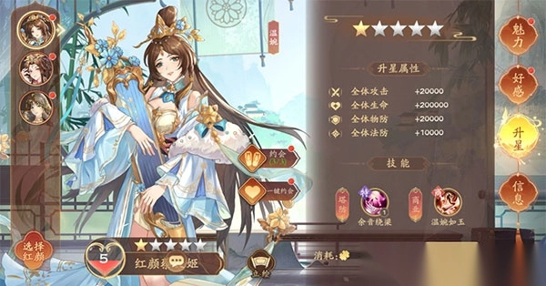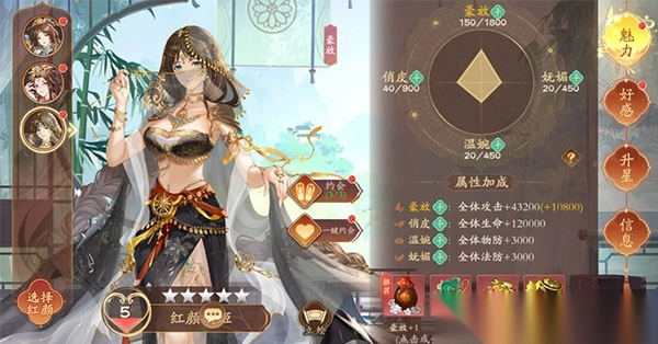 ✦每位红颜具有独特的魅力资质和特性,初始资质不同,资质上限也不同,独特的魅力资质会在对应的属性提升上有额外加成;