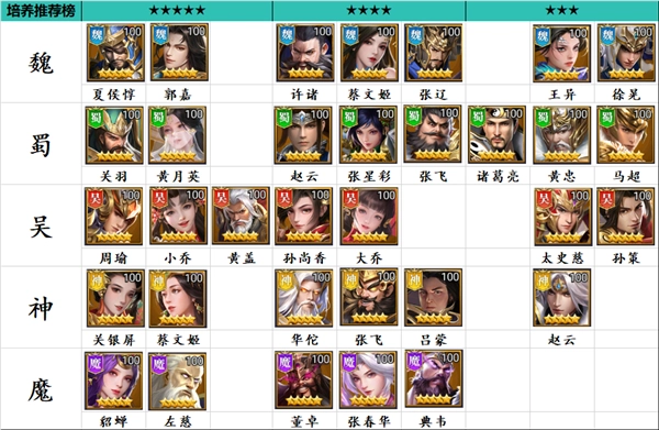 推荐榜主要面向普通玩家,推荐他们前期会用到的英雄,主公和那些较难获取的稀有武将不在推荐范围内。5星推荐的武将是前期使用体验较佳的,建议大家最好依据实际抽到的武将进行合理搭配。