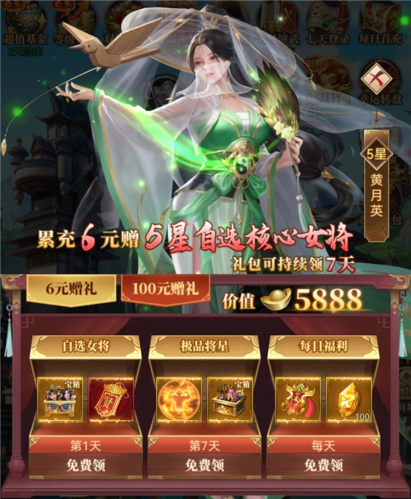 6元首充道具:自选女将(小乔、甄姬、黄月英、蔡文姬、张春华)、招贤令*1
