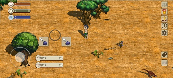 打开右下角标签功能,部分动植物的名称就会显示。名称的背景有灰色和紫色两种。灰色背景道具为一般的道具,可以捡起手持;紫色背景的道具交互后会产生新的道具,如有果实的果树、有蛋的鸟巢都是紫色背景可交互,交互完成后可以得到能食用的果实和蛋。