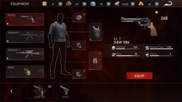 7. 在主界面,点击“equipment”,能够更换角色的武器与装备;点击“inventory”,则可对所使用的武器进行升级。