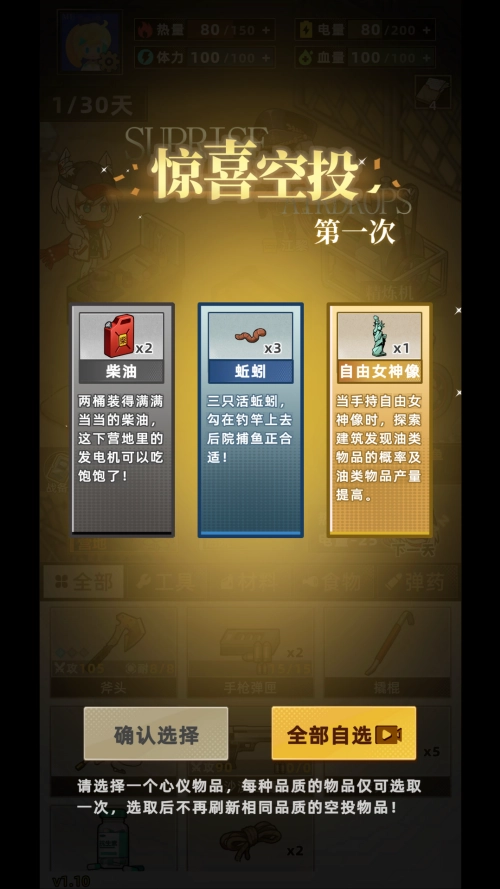 3、游玩过程时不定时有惊喜空投,选择自己所需要的工具或物品