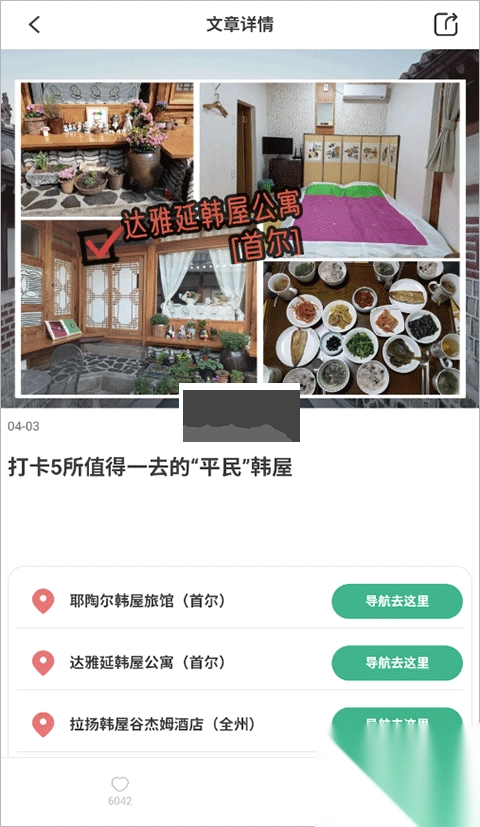 4、小编以“韩国”为示例,点击打开一篇有关韩屋民宿推荐的帖子,便能看到详尽的图文内容,下方还附带详细的地址信息。