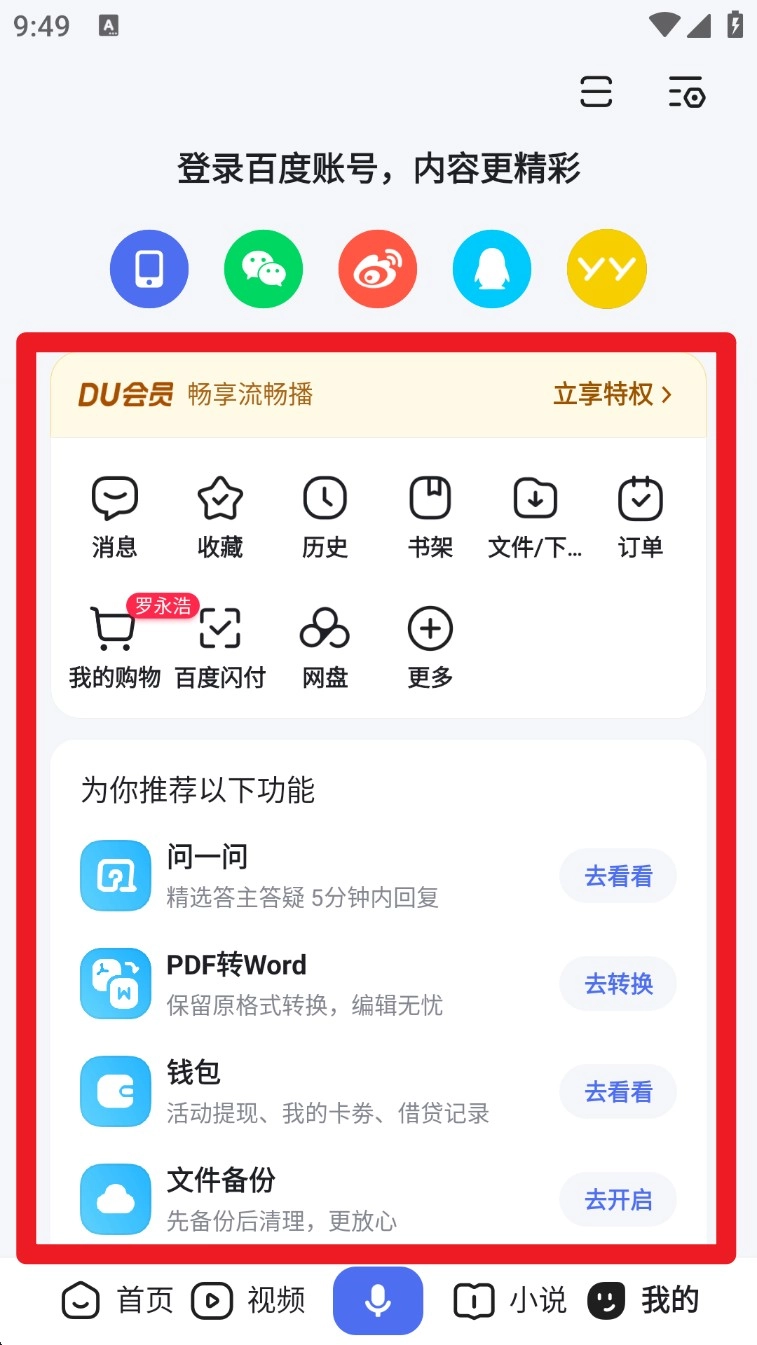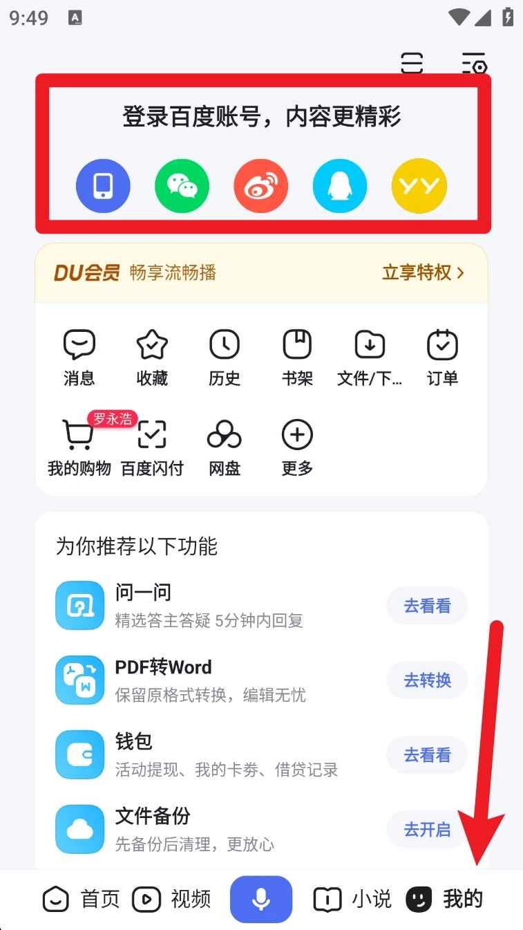 2. 登录成功后,在“我的”页面中可查看消息、收藏、下载、历史等常用入口,管理内容更轻松。