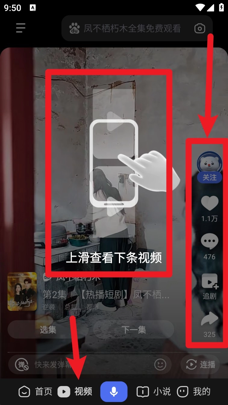 4. 切换到底部“视频”标签,即可进入短视频专区,上滑浏览视频,下方可点播、评论与追剧。