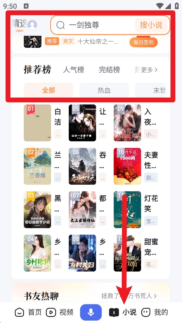 5. 点击底部“小说”入口,进入书城后可搜索小说名、浏览推荐榜与分类榜,直接开读无门槛。