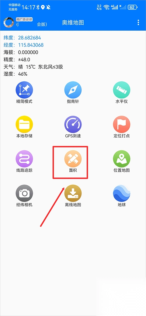 2、进入后再次点击右侧 “面积” 选项,开启测量模式。