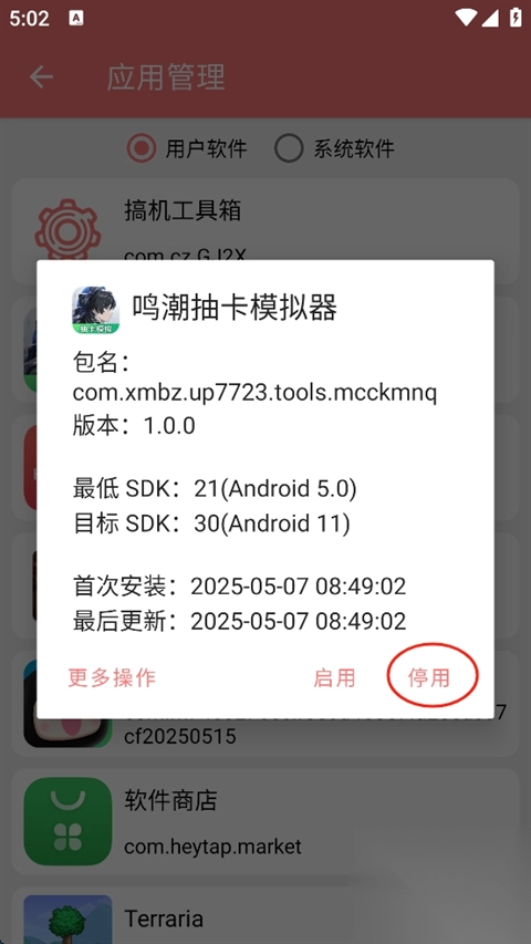 2、软件列表分用户软件和系统软件,点击一个软件,弹出软件信息,在右下角有停用点击就可以停用了,注意一定要ROOT哦,想要恢复软件同样方式点击启用就好了。