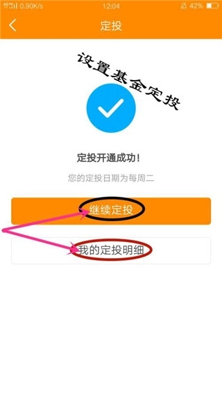 5、接着输入支付密码,就能成功设置定投。如图片所示,点击“定投明细”可查看已设置的定投详细信息,点击“继续定投”便能够再次进行定投设置。