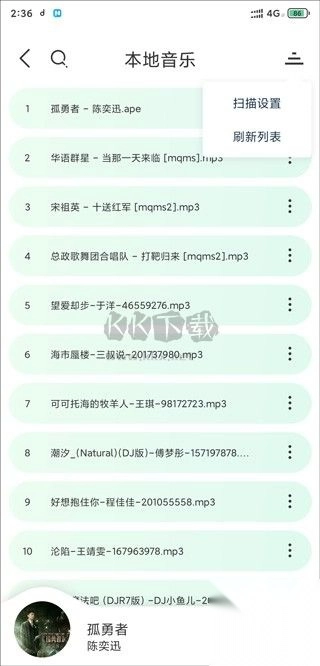 3、轻点右上角的三横按钮,就能对本地音乐进行扫描设置并刷新列表。