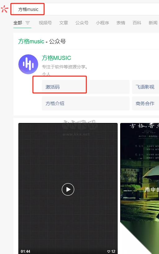 2、于微信公众号中搜索方格music,点击激活码选项,便能查看最新的激活码。