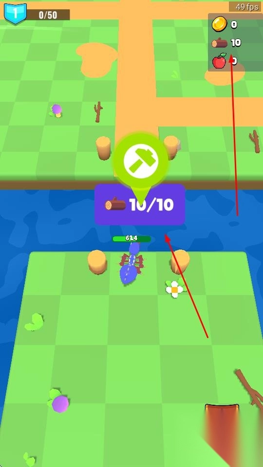 1、操控蓝色生物,靠近树木、苹果等资源,点击工具图标,采集木材、果实,积累生存物资。