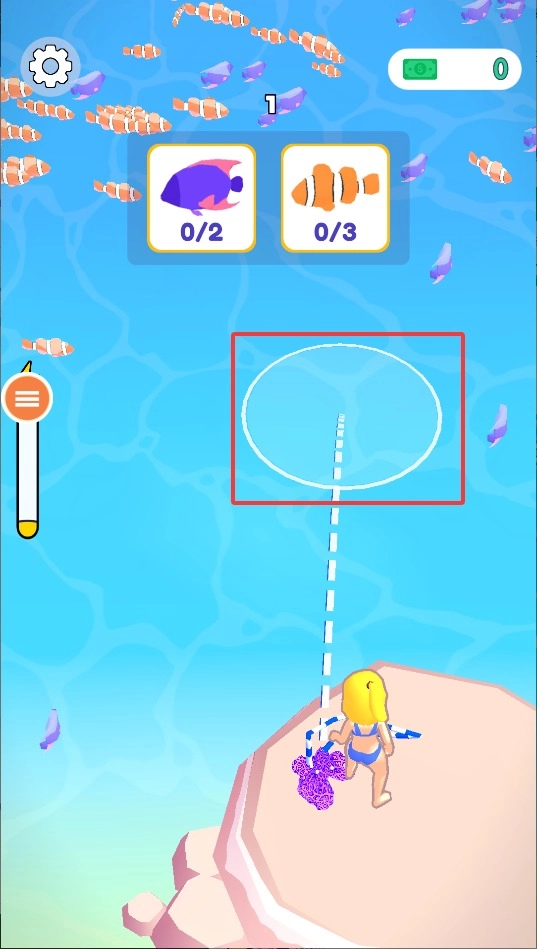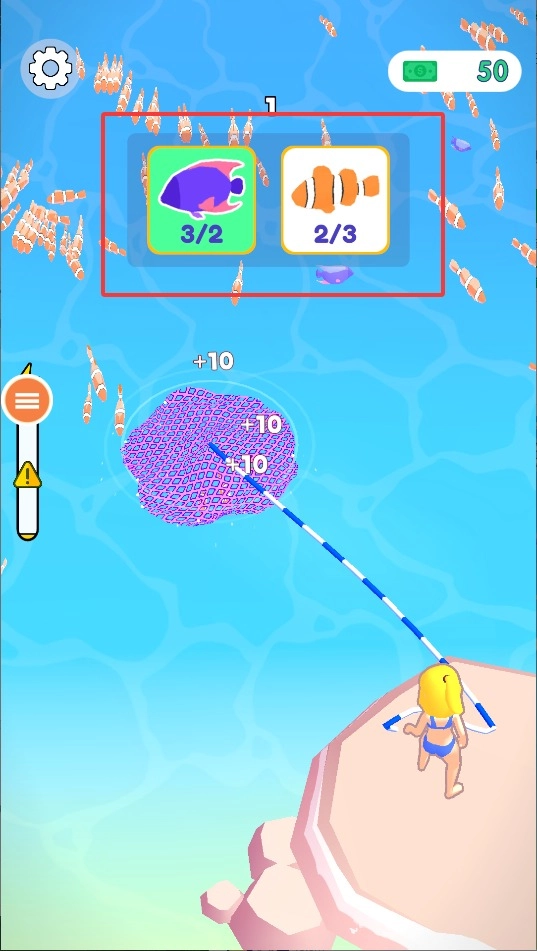 2、长按屏幕拖动渔网调整捕捞范围,看准时机松开完成撒网,不同鱼类需要采用相应的网速和角度才能捕获。