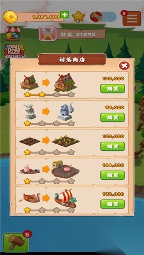 5、获取金币后,能够用来建造物品,每成功完成一次建造就能得到一颗星星,当集齐20颗星星时,便可对村庄进行升级。