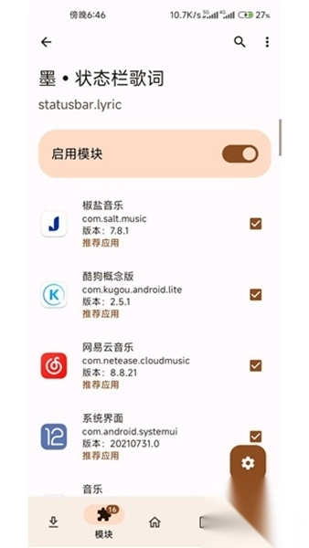 在Lsposed管理器中,搜索并安装“墨状态栏歌词”模块。根据提示进行激活和配置。