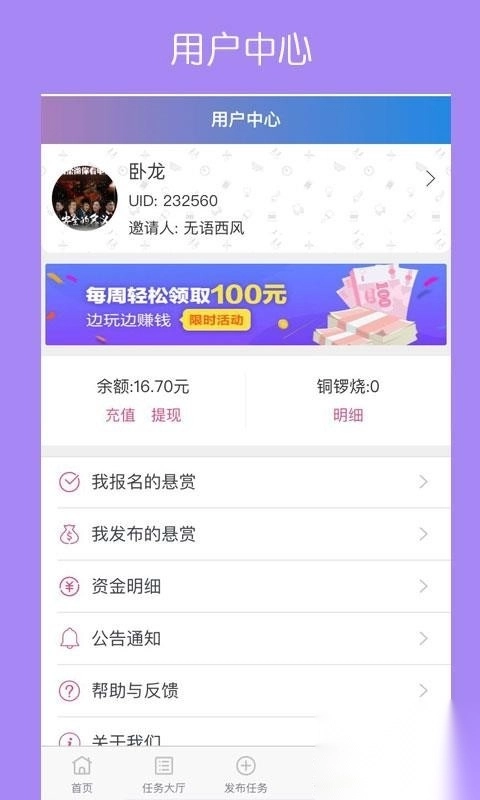 4、点击“用户中心”,查看“余额明细”“发布的悬赏”“报名的悬赏”“资金明细”等板块内容。