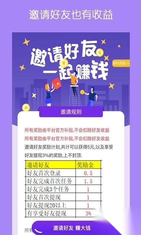 邀请好友可赚取收益,首次登录、完成首项任务、达成规定任务等均能获得打赏。