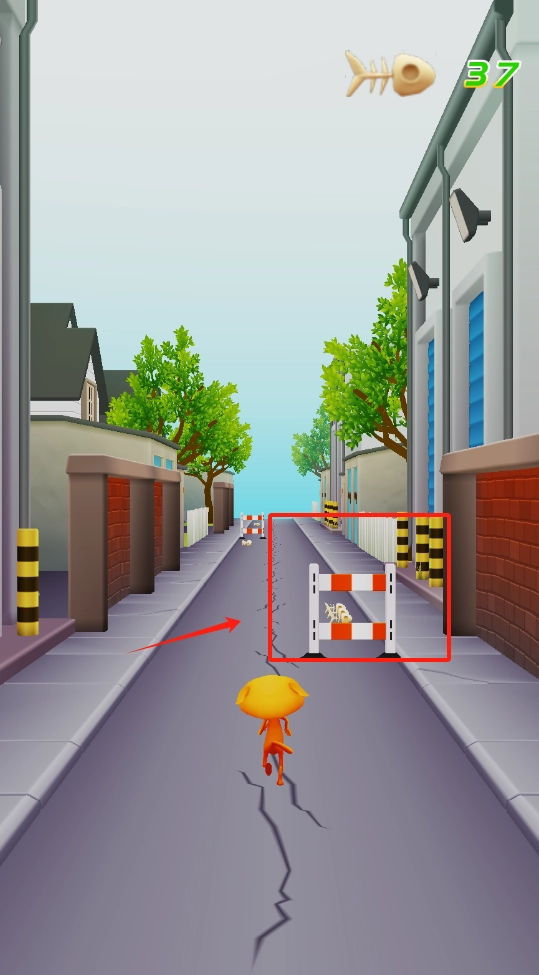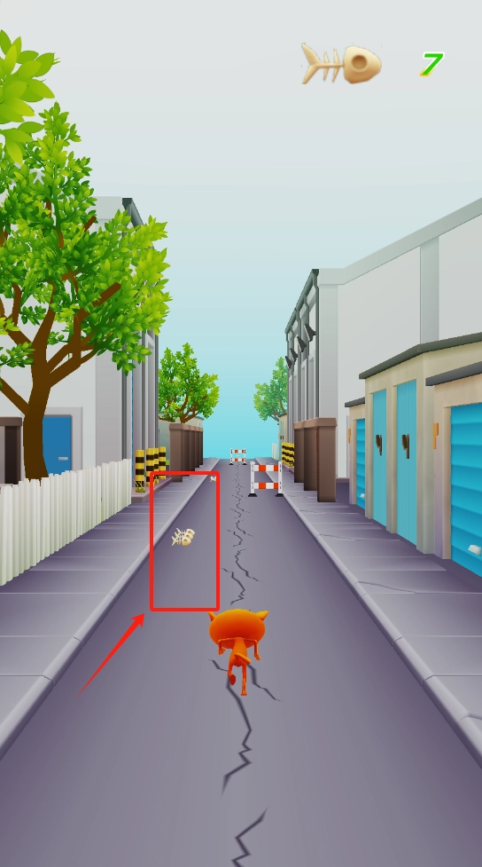 2、操控橙色小猫沿着灰色道路奔跑,避开障碍物,收集空中飘着的鱼骨头得分。