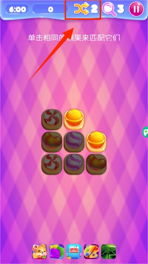 2、你得把相同的糖果连接起来进行消除。右上角显示的是你拥有的道具数量,方框里的是刷新工具,点击它就能让糖果重新排列。