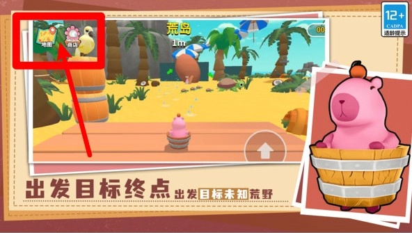 1.主页面左上角可点击“地图”与“商店”按钮,地图按钮进入区域选择,商店按钮可购买皮肤装扮与道具。