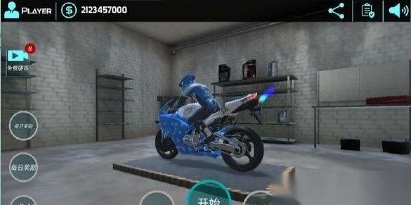 1. 在车库处点击【开始】,选择已解锁的“1号”摩托车,熟悉车辆性能,为赛道竞速做好准备。