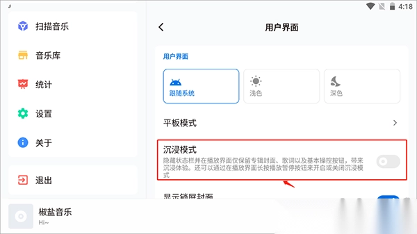 4、在用户界面设置里,你会看到"沉浸模式"的选项,右边有个开关按钮,点一下它。