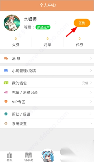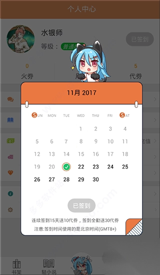 2、每天进行签到之后就能获得5点代券,可以用这个代券来看书。一般来说签到2天可以免费看一章vip,连续签到15天额外赠送10代券,30天赠送30代券。