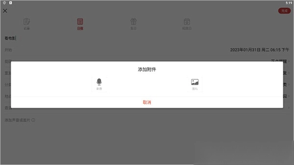 另外日程中还可通过点击【添加声音或图片】来添加录音和图片