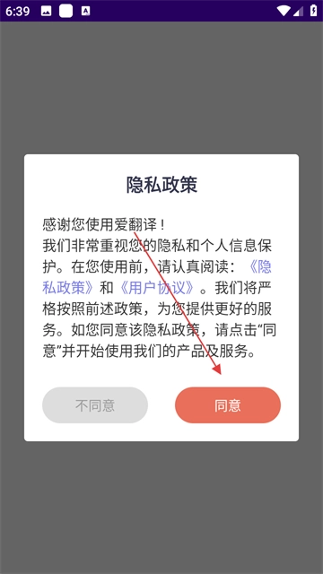 1. 开启爱翻译,此时会弹出隐私政策弹窗,点击【同意】即可进入。