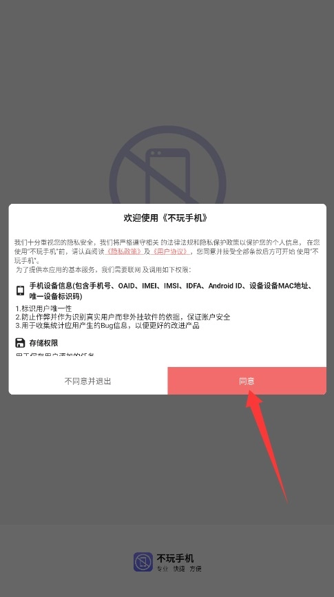 1、首次使用不玩手机APP时,需完整阅读用户协议与隐私政策,点击“同意”按钮方可进入。