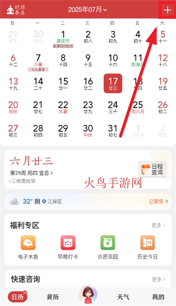 下载安装并打开中华万年历app,进入首页后点击右上角"+"