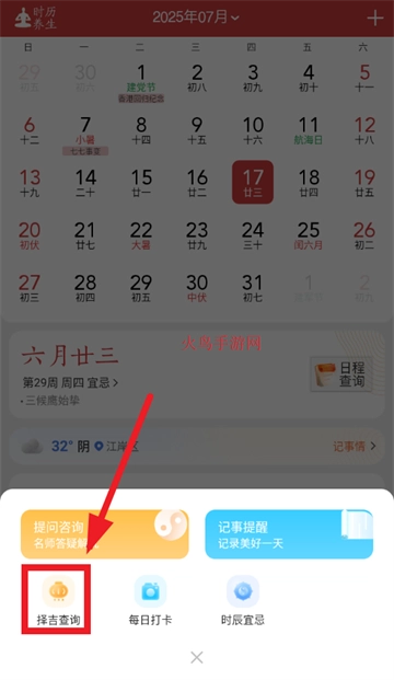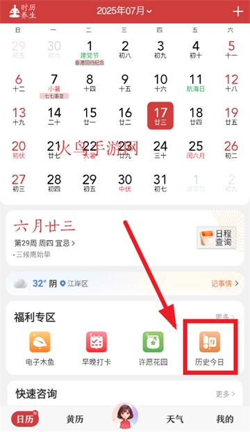 打开中华万年历app,进入首页后点击如图历史今日
