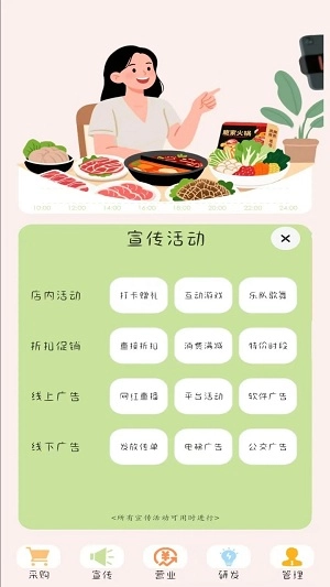 1你能够自主选择并规划多样化的宣传活动,涵盖店内活动、折扣促销以及线上线下广告等。