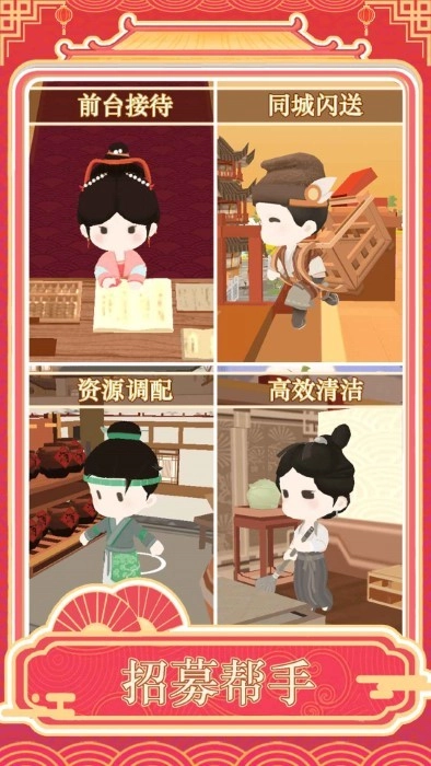 《跑腿掌柜》是一款以古代为背景的酒店模拟手游。在游戏中,你将化身为掌柜,合理规划并建造经营场所。这里不仅要设置供客人住宿的房间,还要打造能让客人用餐的地方。为了更好地运营酒楼,你还需招募更多店员,让他们协助你完成打扫房间、安排住店等各项事务。快来打造专属于你的独特酒楼,开启这段精彩的经营之旅吧!