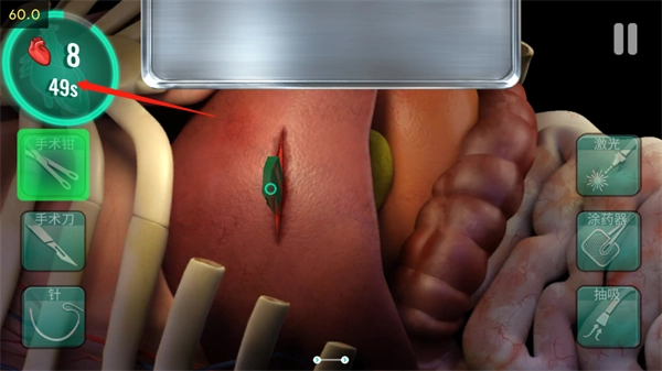 3、达成首次手术任务:点击针线对伤口进行缝合,接着使用涂药器处理外部创口。