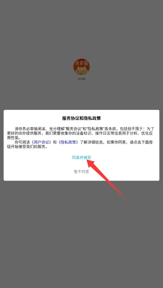 1. 首次运行米多猫APP,系统会弹出用户协议与隐私条款,阅读结束后,点击“同意并接受”按钮即可进入主界面。