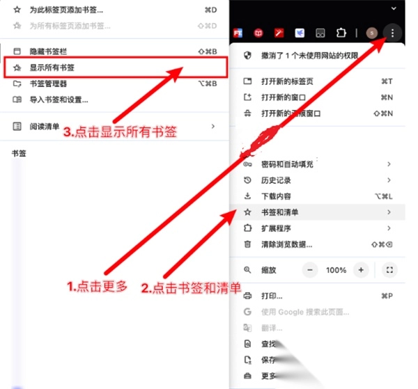 1、点击地址栏右侧3个点【更多】-【书签和清单】-【显示所有书签】。