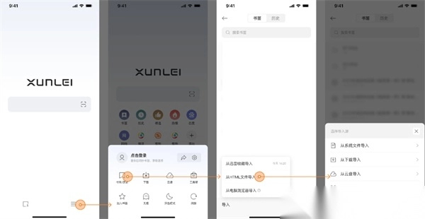 2、导出书签.html文件,发送至手机,在手机上打开【迅雷浏览器】,找到【书签】选项中的【导入】功能,点击【从HTML文件导入】,选择合适的导入方式即可。