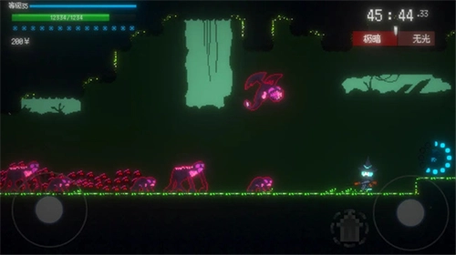 1、游戏采用横版动作的形式展开,玩家需要利用画面左侧的虚拟摇杆操作角色进行横版动作冒险;