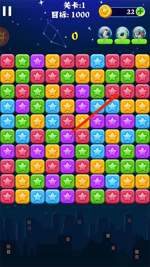 3、进入【游戏界面】,找到两颗或者三颗颜色相同的星星,并且【点击】它们,就可以把它们消除并获得分数,