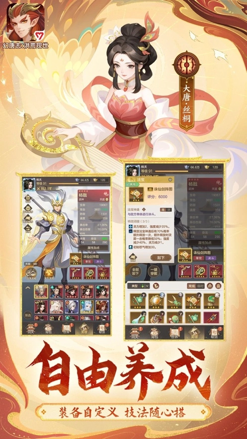 2、【精美画面】:游戏呈现出令人称奇的视觉效果,对唐代盛世与洪荒那充满奇幻色彩的景色进行了细腻刻画。